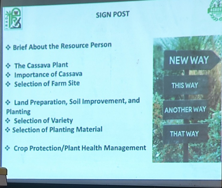 Using a projector the facilitator made PowerPoint presentations on the first level of the cassava value chain which is the cassava plants, best practices to setup a cassava farm and the management of pest and diseases. The presentation was interactive as participants shared their experience on cassava farming and how they transform the cassava into other products.